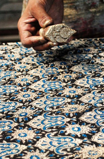 Ajrakh, a traditional craft of wood block printing, is a celebration of Mother Nature. Blue and red, the pre-dominant colors represent the Sky and Mother Earth.