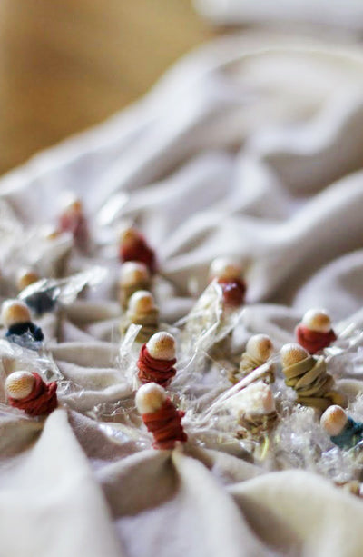 Thousands of miniscule knots are tied strategically on the woven fabric before dyeing and then it is dyed.